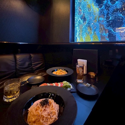 重厚感のあるカウンターなど、どこに座っても上質な居心地を感じていただける空間です。単なるバーの枠を超え、レストランとしてもラウンジとしても機能する洗練されたデザインが魅力。水槽を眺めながら癒やされるもよし、仲間と語らうもよし。非日常的な空間が、あなたの夜を特別なものにします。